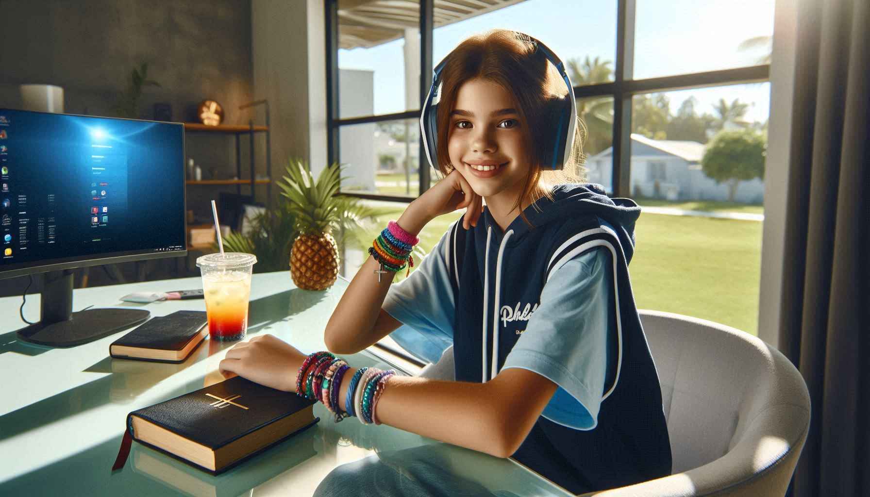 como guardiana de su propio universo gráfico, su sonrisa no es casual: es un gesto de dominio suave, de quien ha conquistado la interfaz sin perder la ternura. brazaletes de cuentas, reloj rosa y la bebida tropical en forma de piña no son accesorios, sino emblemas de una estética que mezcla juego, afecto y presencia. frente al monitor, los círculos futuristas no la absorben: ella los coreografía. esta escena no documenta una moda, sino una actitud ceremonial donde el diseño, el juego y la emoción se entrelazan como códigos de una travesía gráfica