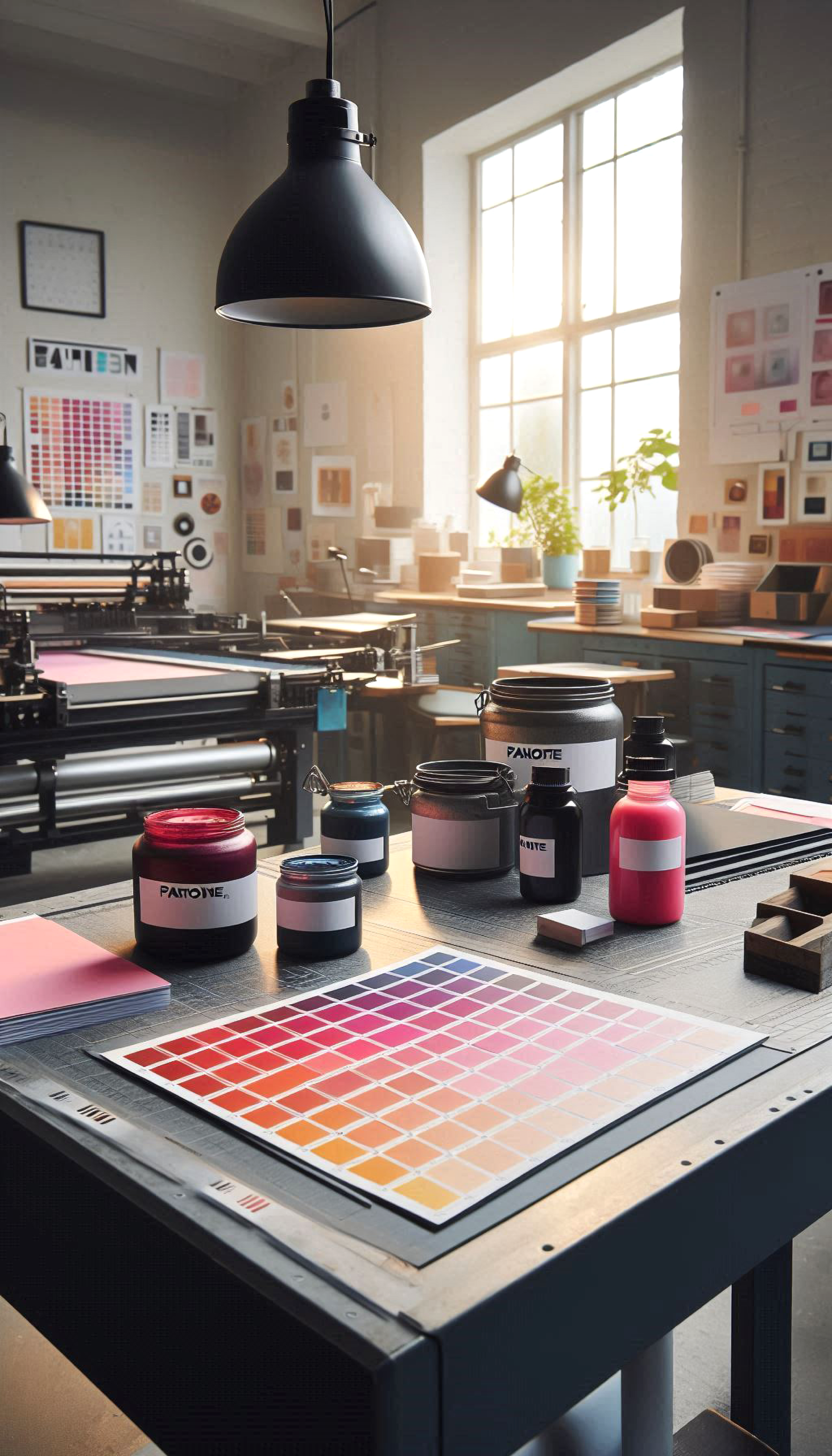 el estudio de impresión se revela como un santuario de pigmentos y precisión. las tintas en tonos rosados, rojos y negros se alinean como ofrendas sobre la mesa central, mientras las muestras de color giran como mandalas cromáticos. las cartas de color en la pared y los rayos de luz natural que bañan el espacio evocan un ritual técnico donde cada tono se elige con devoción. este imprime y traduce ideas en emblemas visuales, donde el ocio se vuelve método y la tendencia en ceremonia.